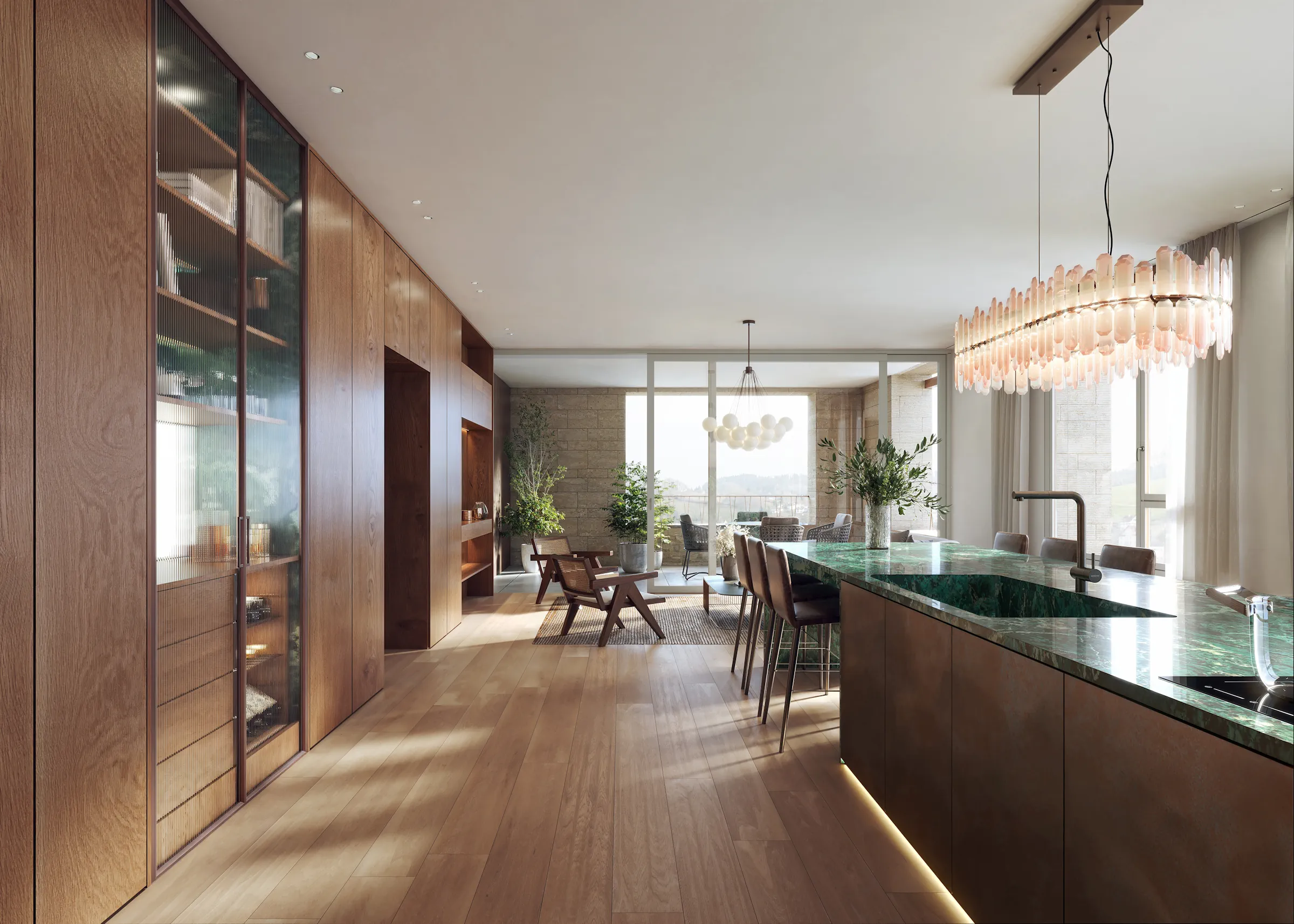 Jede Einheit ist technisch auf dem neuesten Stand: Smart-Home-Steuerung (KNX), Fussbodenheizung, kontrollierte Lüftung und dimmbare LED-Beleuchtung gewährleisten höchsten Wohnkomfort. Küchen und Garderoben sind massgeschneidert, mit hochwertigen Naturstein- oder Keramikabdeckungen sowie Premium-Geräten von BORA und Miele.